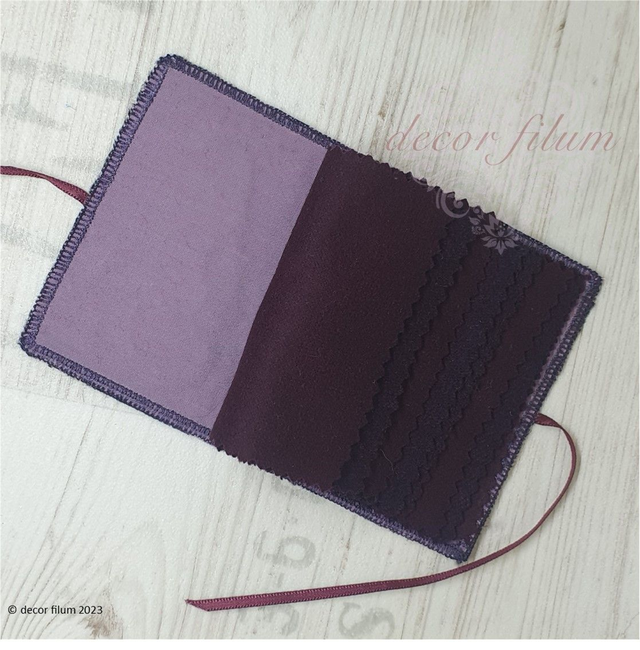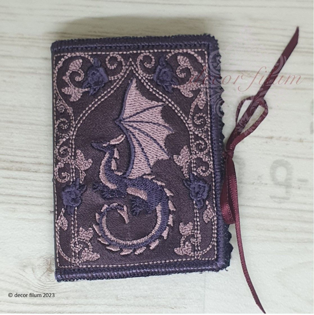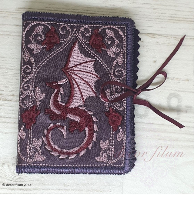 mit romantischem, edlen Drachen in einem verschnörkelten Torbogen besticktes Nadelmäppchen in Buchform - für Ordnung und Sicherheit bei Näh-, Stick- oder Filznadeln